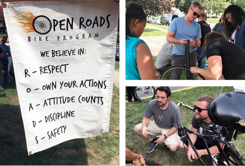 I had never heard of the non-profit Open Roads (a Kalamazoo organization teaching local youths bike maintenance and mechanical skills, as well as social skills, to better prepare them for the future) and had no idea what to expect when I arrived at the event. But I was quickly introduced to the Open Roads staff, coached on how to work with the kids, and then paired with a teen needing assistance. Having limited experience, I joined more seasoned coworkers, Joe Regimbald, Eric Heffernan, and Lars Chrisman, along with the kids, to learn a thing or two about bike repair and maintenance.