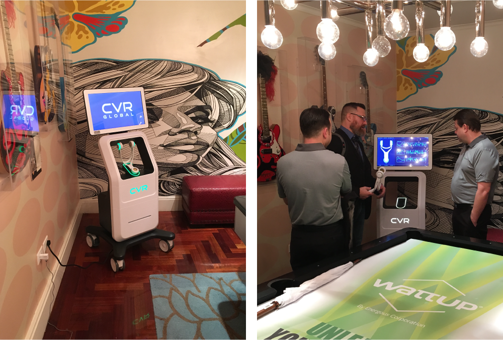 With the lighting squared away, we finished prototype development, built a custom shipping crate, handled delivery logistics, and then traveled to the show to orchestrate set-up in Energous’ private suite (Energous supplies RF charging technology). In the mix of products displayed, our large prototype—finished to a production-aesthetic with functional lighting—really stood out. See for yourself: