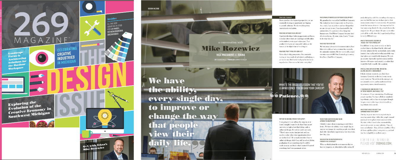 Don’t miss the recent 269 Magazine’s Design Issue interview with our very own Mike Rozewicz. You can read his perspective on the multifaceted world of product development, as he shares personal success stories and dishes out career advice. In the issue’s featured article, “Exploring the Evolution of the Creative Economy in Southwest Michigan,” both Mike and Emily Hoffmann talk about the area’s burgeoning creative community and how it’s attracting—and retaining—top-notch talent.